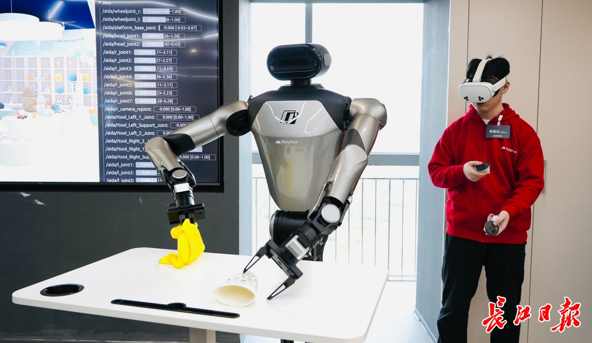 走进机器人学校的国内场景,有的机器人学会叠衣服,有的机器人学会轻轻拿起抹布,或者用力擦桌子。在机器人旁边,机器人训练员佩戴虚拟现实设备,手持传感器设备,同时与机器人一起“工作”。